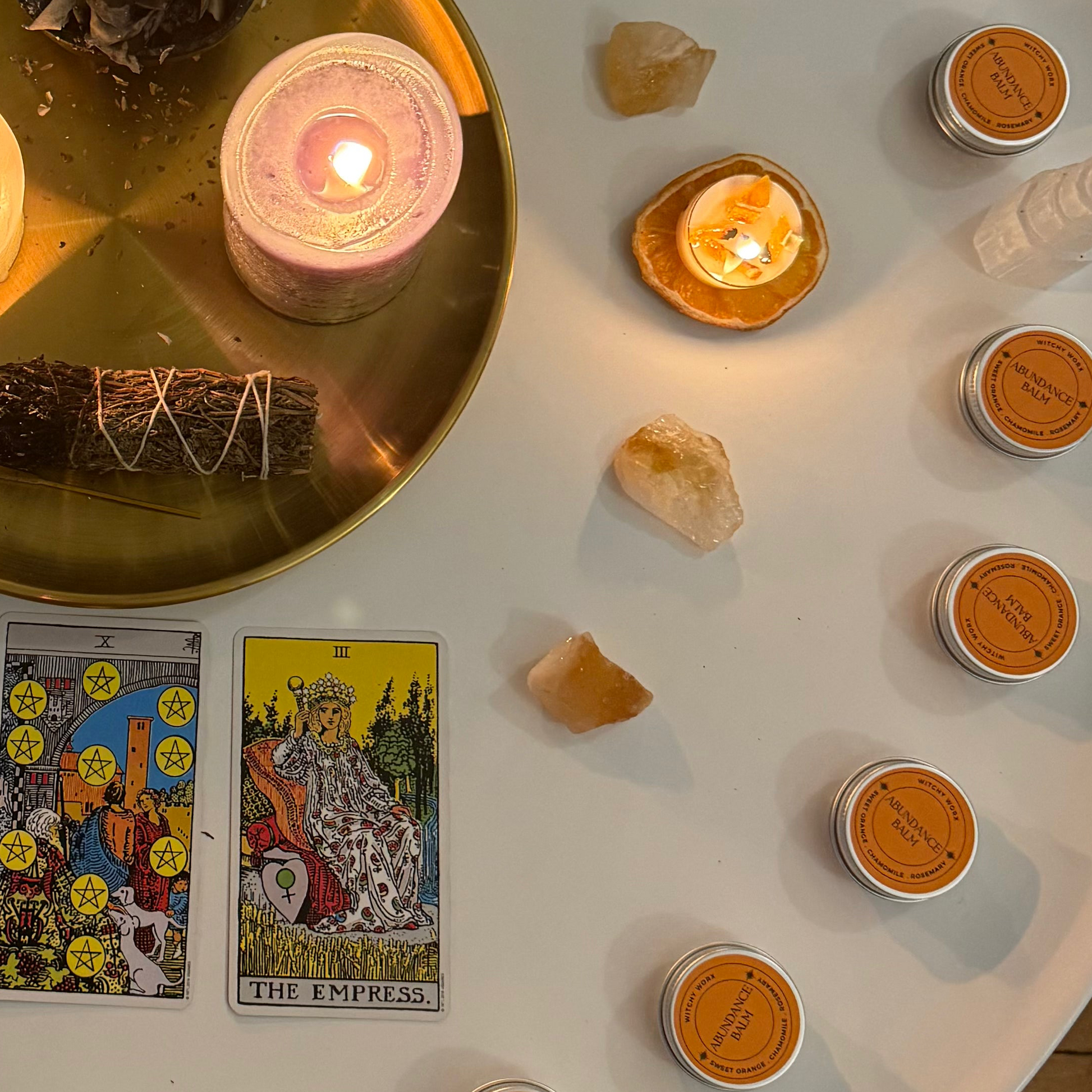 Handcrafted with care and intention, Abundance Balm is infused with natural essential oils known to attract prosperity, joy, and opportunity. Each balm is lovingly, poured with the energy of golden growth, sweet orange to uplift and invite prosperity chamomile offers financial peace, unblocks stagnation and calms money fears, and rosemary to call in clarity, confidence, and success. Made with natural, skin-loving ingredients and charged with intention to support your manifestations. Use as a daily ritual to align with abundance in all forms. Each Balm is delivered with an affirmation card, ritual and guide on when to use.